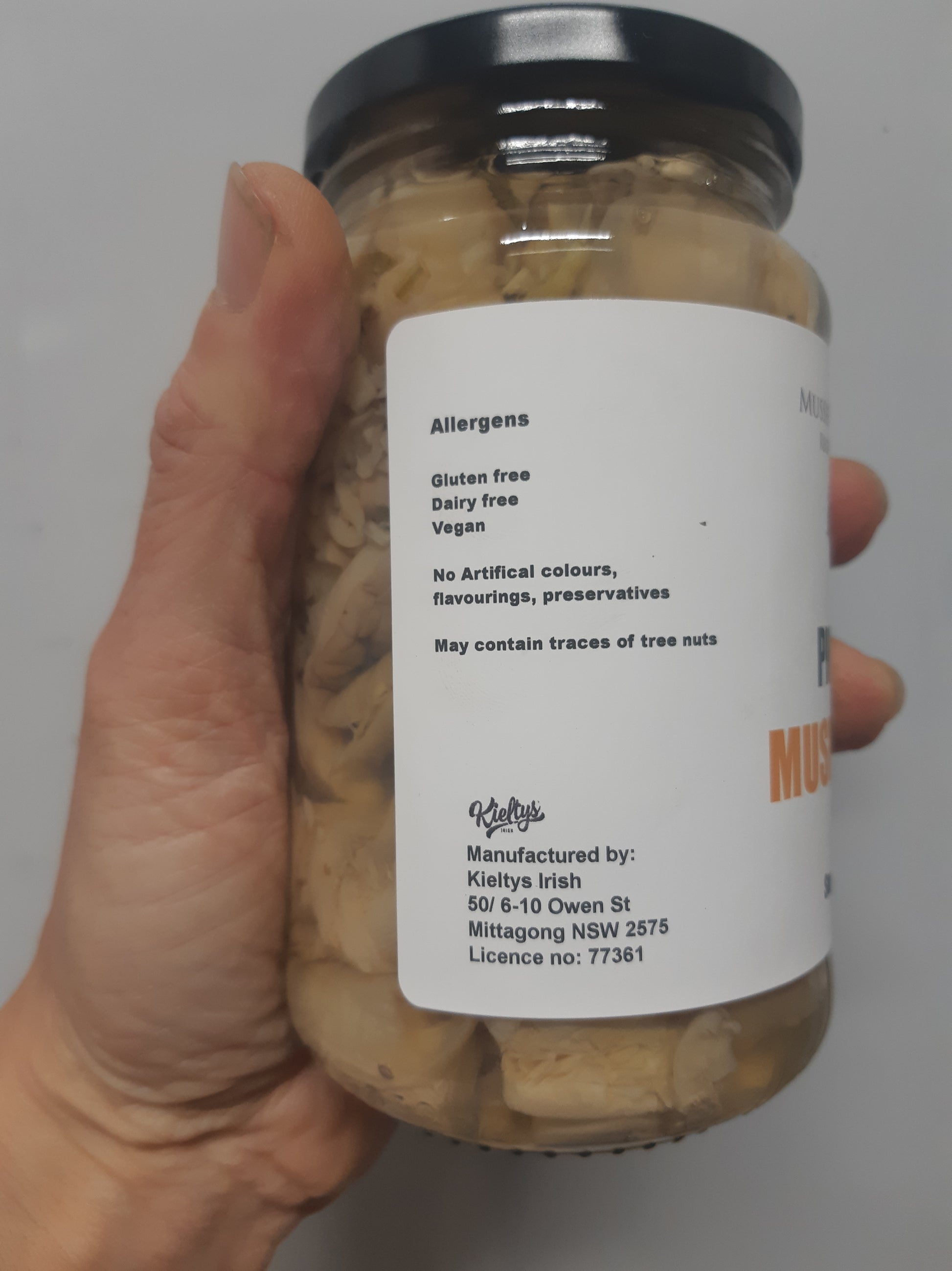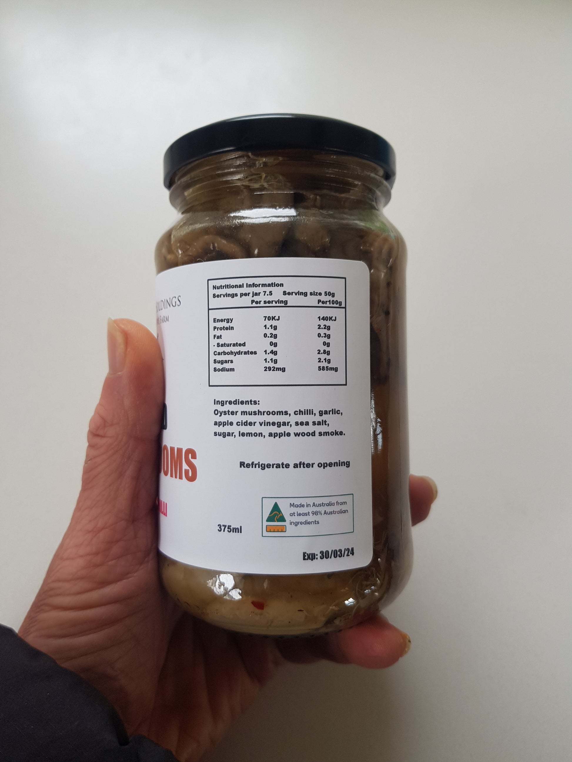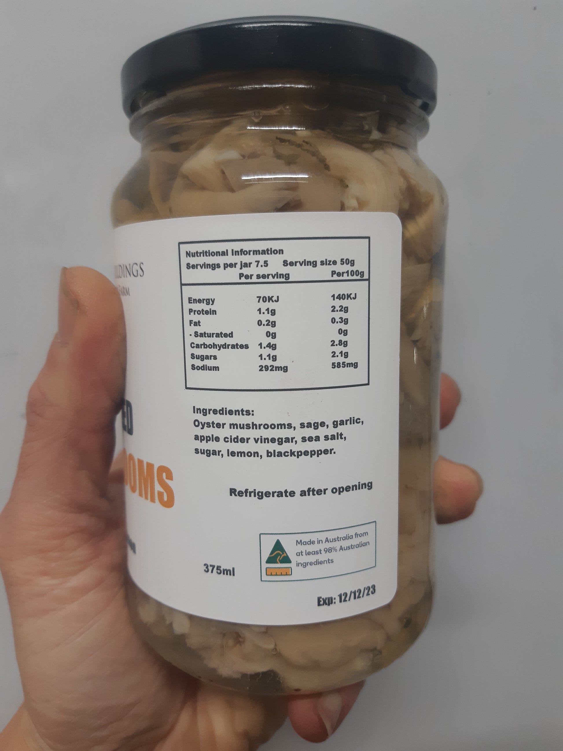 These pickled mushrooms have been prepared by Kieltys Irish in Mittagong using our blue and white oyster mushrooms. Two flavours available - (1) Sage & Lemon or (2) Smoked Chilli.